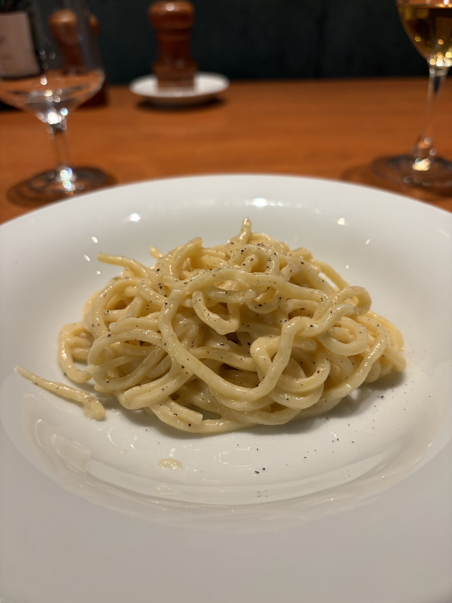 シメはパスタです。パスタは何種類からか選べるのですが、シェフ一押しという「カーチョエぺーぺ」をお願いしました。