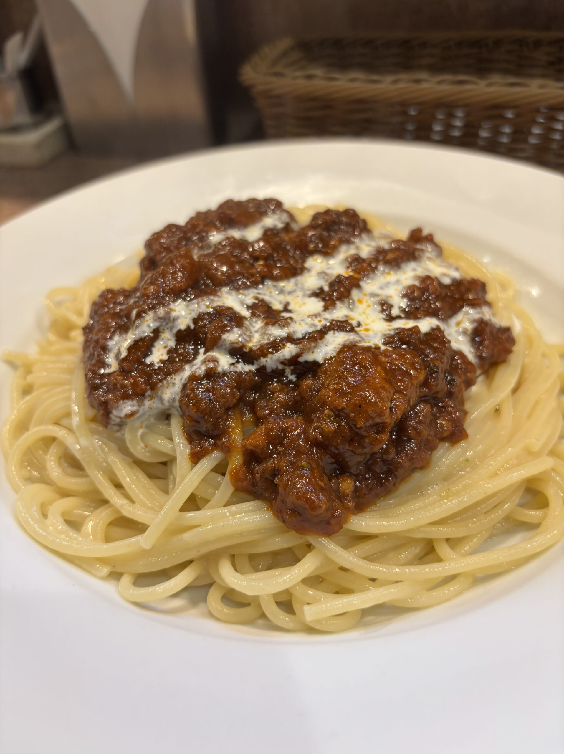 運ばれてきた瞬間、立ち上る濃厚な香りに、食べる前から「勝ち」を確信しました。 このソース、とにかく旨味の密度がすごいんです。じっくり煮込まれたひき肉のゴロゴロとした食感と、深いコク。そして特筆すべきは、あえての「乾麺」であること。